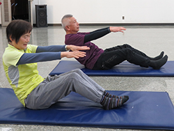 自分のレベルに合わせて、背中の座布団の枚数を調整してください。膝は曲げて、反動をつけずに起き上がりましょう。 -