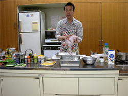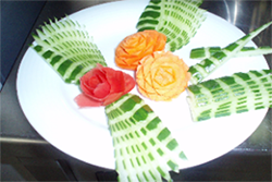 今回は、「デコレーションにチャレンジ」がテーマです。クリスマスが近いのでいつもの野菜をおしゃれにカッティングして、無駄なく使い切る方法を実習体験しました。きゅうりやトマトを包丁1本で飾り切りをしてみる。何気なく使っているものも、ちょっと発想を変えることで価値が生まれます。ねらいは、「食材の価値を見直し、廃棄を減らす考え方を持ちましょう。」